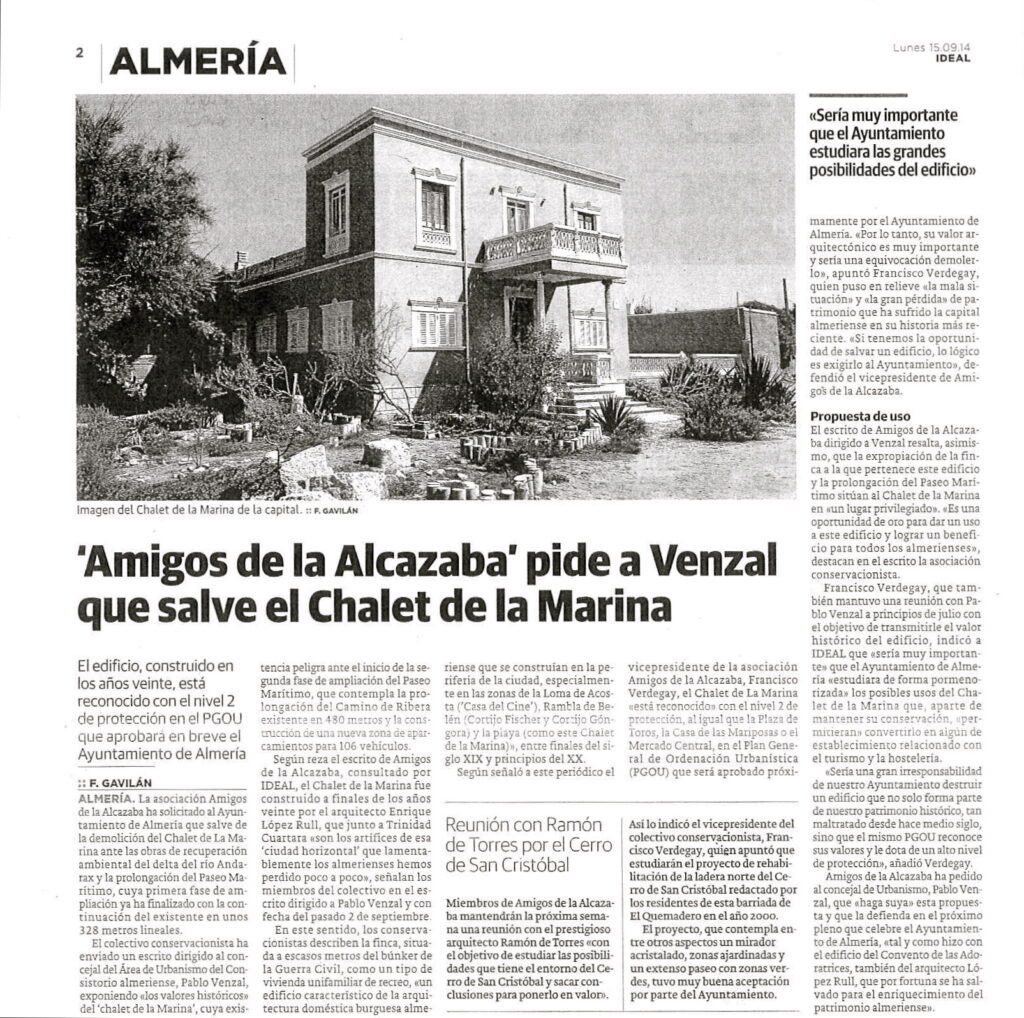 Pero Amigos de la Alcazaba paralizó el derribo, tras ser atendido su escrito y conversación con el entonces concejal Pablo Venzal, que hay que reconocer que atendió rápidamente a nuestros argumentos: se iba a derribar un “edificio característico de la arquitectura doméstica burguesa almeriense que se construían en la periferia de la ciudad, especialmente en las zonas de la Loma de Acosta (“Casa del Cine”), Rambla de Belén (Cortijo Fischer y Cortijo Góngora) y la playa (como este Chalet de la Marina), entre finales del siglo XIX y principios del XX”. Además, al no aprobarse el PGOU de 2012 quedó desprotegido, pero eso, argumentaba Amigos de la Alcazaba, no le quitaba ninguno de sus valores históricos.