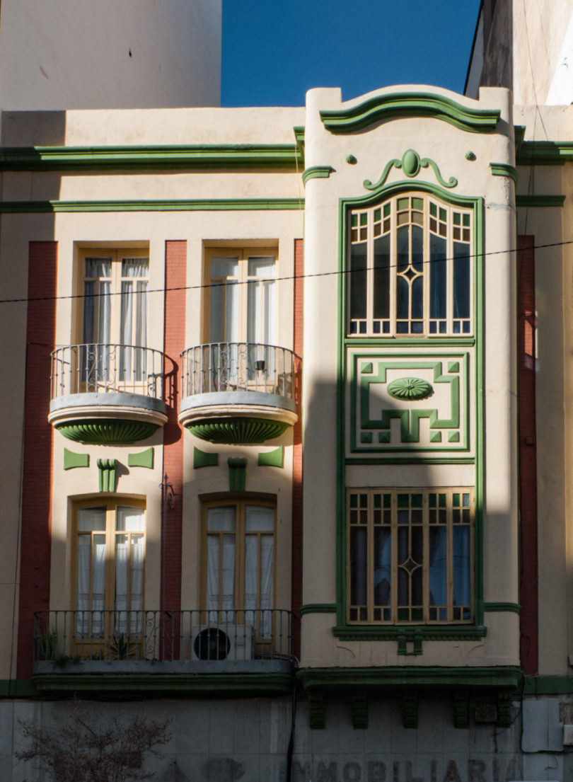 Desde mi ventana, en la plaza de Santa Rita, veo la Casa de Diego Rodríguez, neo-barroca, construida en 1950, y la Casa Góngora reformada en el mismo año, hoy en mal estado, donde sólo resiste la Librería Nobel, esperemos que por muchos años. A dos pasos, en la calle Santos Zárate, se encuentra la nueva Biblioteca Municipal, anteriormente sede de la Policía Municipal, un edificio de estilo racionalista del año 1935, entonces destinado a la Asociación de Asistencia Social de Almería, que me parece especialmente interesante, siendo uno de los más singulares de Almería. ¿Qué une estos tres edificios? Un mismo nombre, él de un gran arquitecto, Guillermo Langle, cuyos edificios están presentes por toda la ciudad, con estilos muy variados.